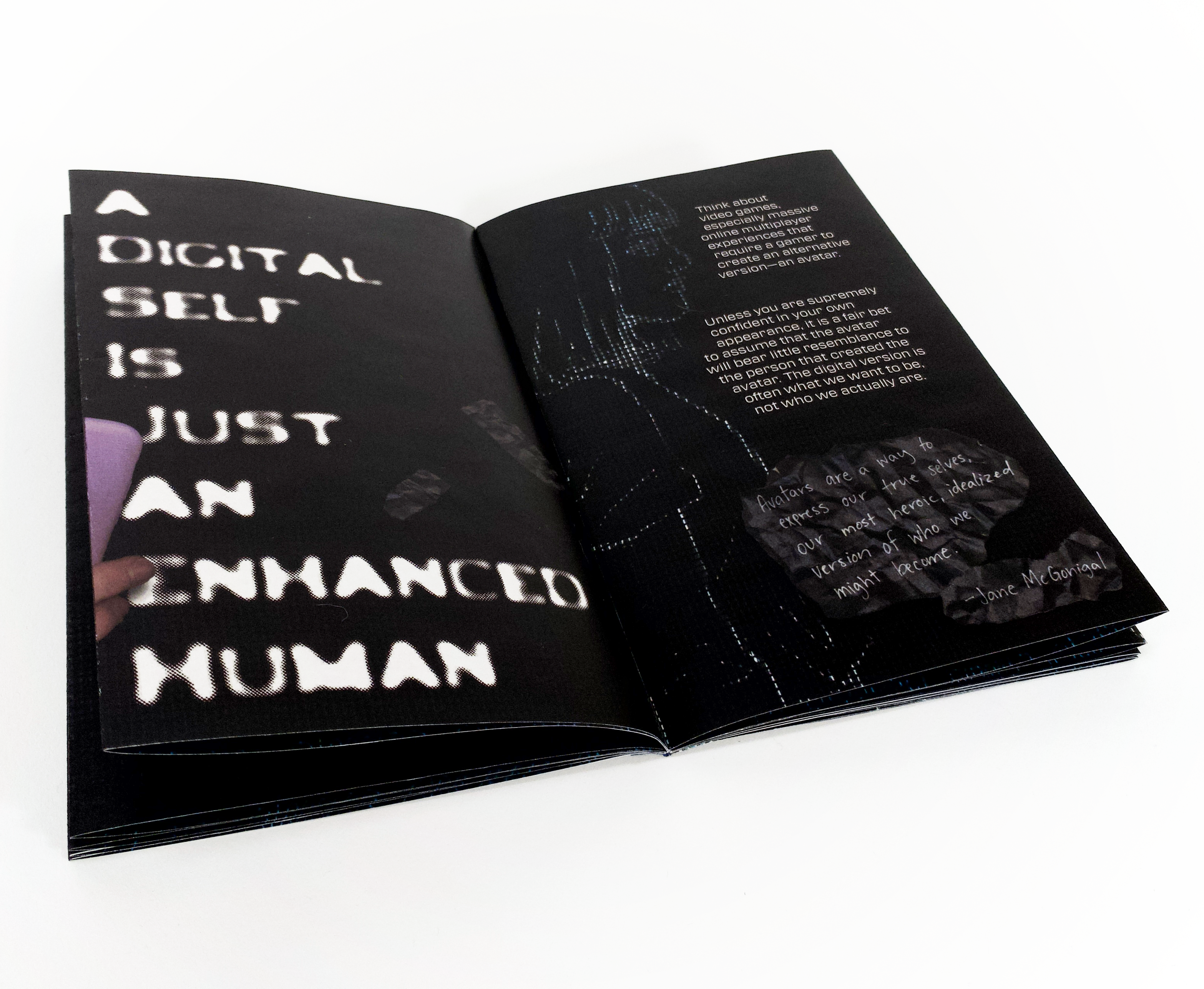 For the ISTD prompt “The Spaces Between,” I chose to focus on the space between our physical and digital selves. Within the zine are quotes which ponder the overlaps and divergences between the two key aspects of our identities in the modern age. Accompanied by words from Nick Bolton, this zine is just the surface of a larger conversation happening around our ever-evolving identities as humans.